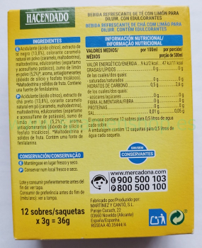 Hacendado Tee mit Zitrone, löslich, 12 Beutel, 36 gr.